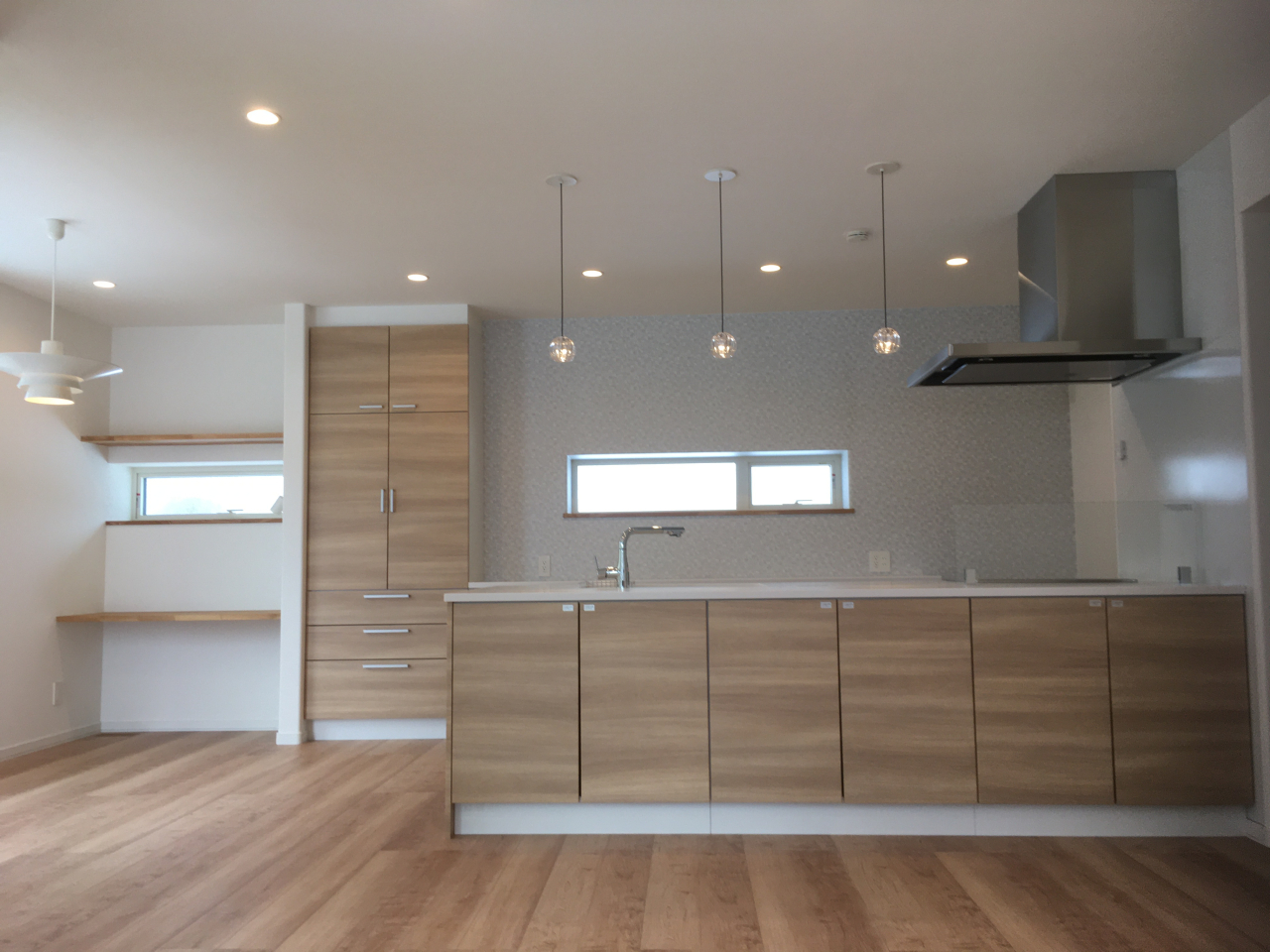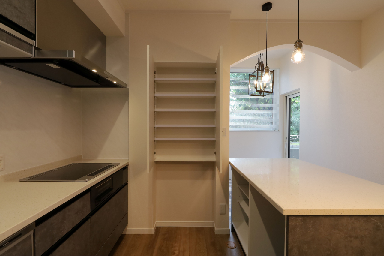ナチュラルな色合いで収納たっぷりのフルフラットキッチン