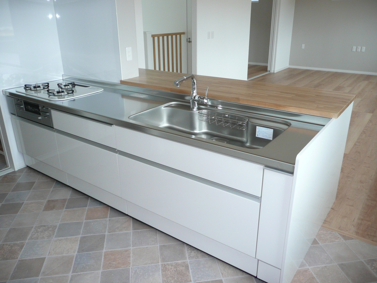 バイブレーション加工のステンレスが高級感を増すフラット対面キッチン